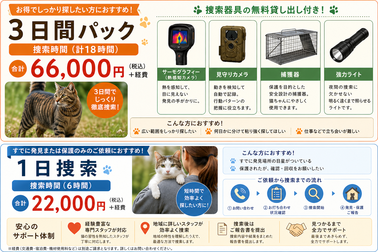 猫の発見の実績も豊富で、料金も分かりやすくなっております。緊急のお客様もお気軽にお問合せください。